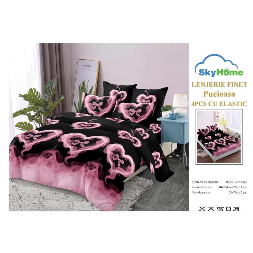 - cearceaf pentru pat: 140cm x 200cm + 25cm (coboara pe langa saltea)